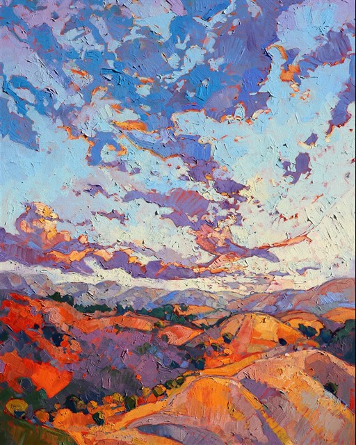 Style: "Open Impressionism" is a new style of painting developed by American artist Erin Hanson. The style is characterized by short, impasto brush strokes that are applied without layering, creating a mosaic or stained-glass appearance to the paintings. The paintings are created with a limited palette of colors, applied without blending or mixing upon the canvas, which adds a dimension of texture to each brush stroke. Inspired by classic impressionism, pointillism, and post-impressionism, Erin Hanson continues the tradition of impressionism into the modern day with her colorful and vivacious landscape paintings.