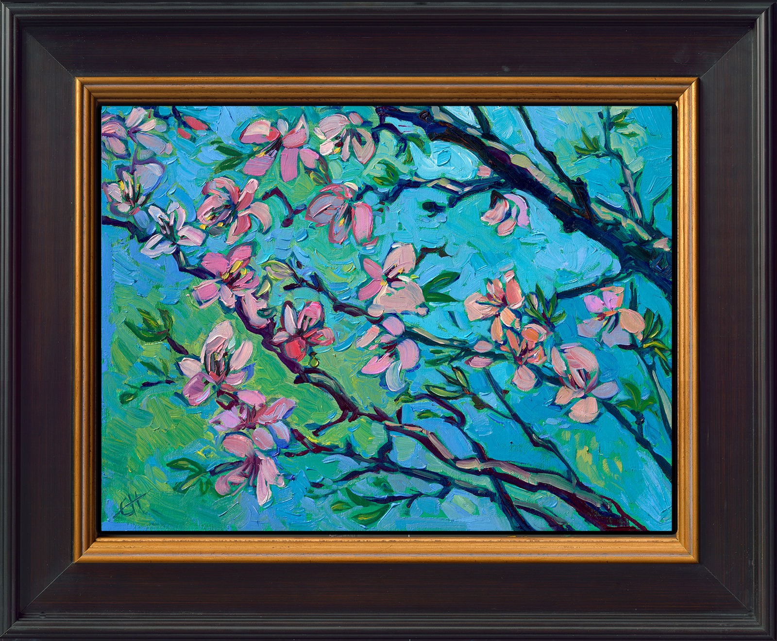 Note on varnishing: Erin’s paintings take six to eight weeks to dry, at which time we apply a retouching varnish, which allows the painting to complete the curing process while having a layer of protection against dirt and scuffs. The full curing process for an impasto oil painting takes at least two years. We are happy to assist in applying a final finishing varnish to your Erin Hanson oil painting once it has been dry for at least two years. Here is more information on how to care for your original oil painting.