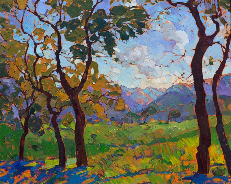 Style: "Open Impressionism" is a new style of painting developed by American artist Erin Hanson. The style is characterized by short, impasto brush strokes that are applied without layering, creating a mosaic or stained-glass appearance to the paintings. The paintings are created with a limited palette of colors, applied without blending or mixing upon the canvas, which adds a dimension of texture to each brush stroke. Inspired by classic impressionism, pointillism, and post-impressionism, Erin Hanson continues the tradition of impressionism into the modern day with her colorful and vivacious landscape paintings.