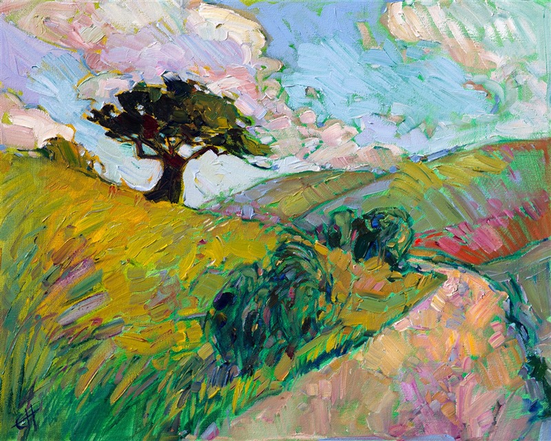Spring greens and baby blues come together in this magical painting of rolling hills and winding roads in Paso Robles, California. The brush strokes convey a sense of motion with their loose and impasto style.