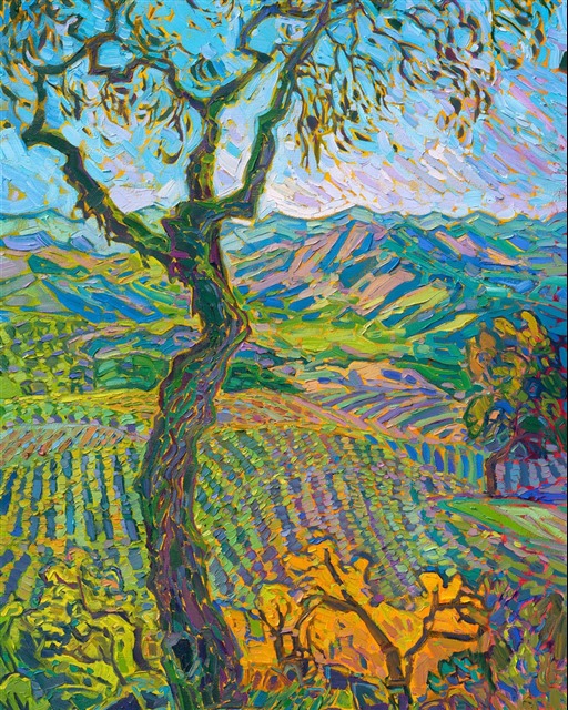 Please note: This painting will be hanging in a museum exhibition until November 5th, 2023. This piece is included in the show Erin Hanson: Color on the Vine at the Bone Creek Museum of Agrarian Art in Nebraska. You may purchase the painting now, but you will not receive the painting until after the show ends in November 2023.