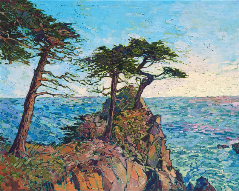 I never tire of painting the wind-sculpted cypress trees of Pebble Beach. Their unique, curving branches are a joy to capture with my brush, and I feel transported into an idyllic universe every time I paint the Monterey Peninsula. The aqua-colored waters of the Pacific are the perfect tranquil backdrop to the grove of cypress tress.