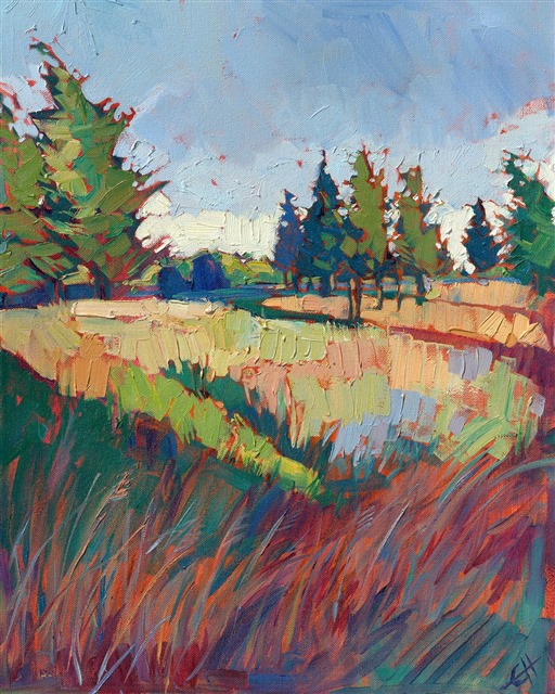 Style: "Open Impressionism" is a new style of painting developed by American artist Erin Hanson. The style is characterized by short, impasto brush strokes that are applied without layering, creating a mosaic or stained-glass appearance to the paintings. The paintings are created with a limited palette of colors, applied without blending or mixing upon the canvas, which adds a dimension of texture to each brush stroke. Inspired by classic impressionism, pointillism, and post-impressionism, Erin Hanson continues the tradition of impressionism into the modern day with her colorful and vivacious landscape paintings.