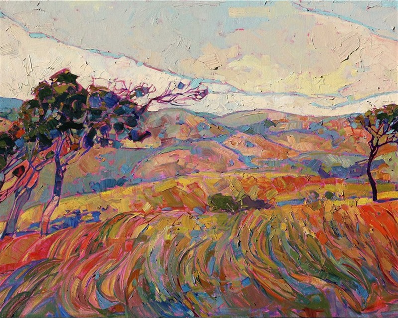 Style: "Open Impressionism" is a new style of painting developed by American artist Erin Hanson. The style is characterized by short, impasto brush strokes that are applied without layering, creating a mosaic or stained-glass appearance to the paintings. The paintings are created with a limited palette of colors, applied without blending or mixing upon the canvas, which adds a dimension of texture to each brush stroke. Inspired by classic impressionism, pointillism, and post-impressionism, Erin Hanson continues the tradition of impressionism into the modern day with her colorful and vivacious landscape paintings.