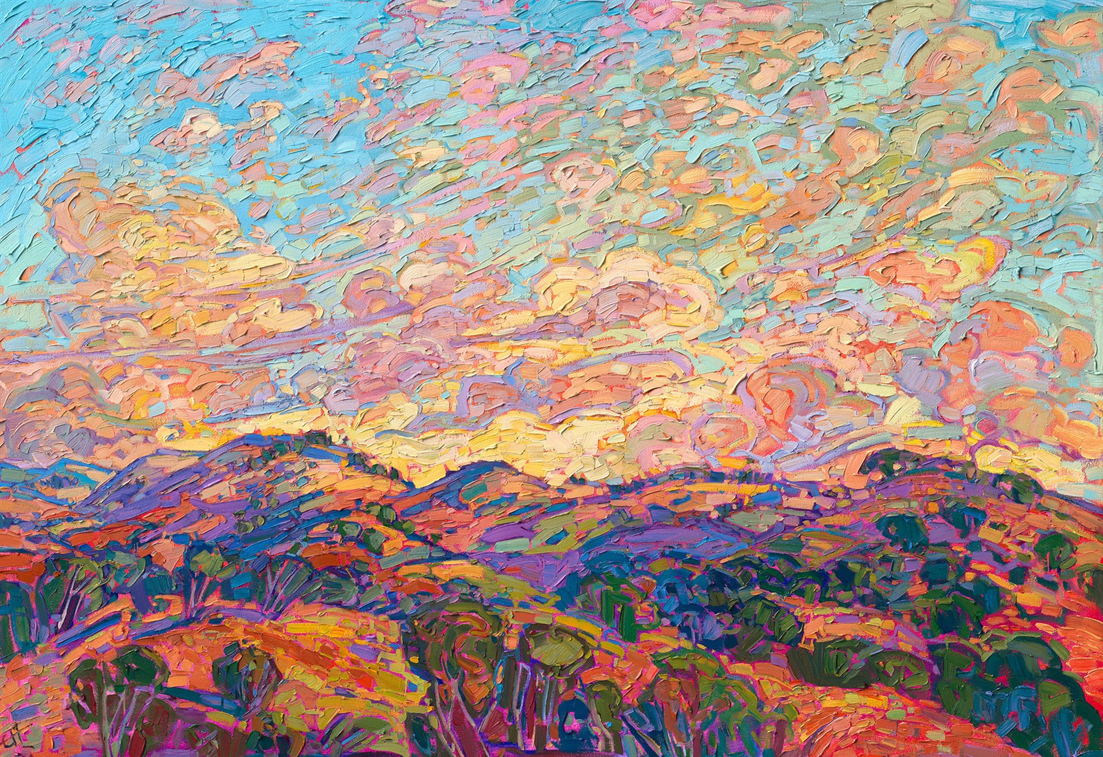 Style: "Open Impressionism" is a new style of painting developed by American artist Erin Hanson. The style is characterized by short, impasto brush strokes that are applied without layering, creating a mosaic or stained-glass appearance to the paintings. The paintings are created with a limited palette of colors, applied without blending or mixing upon the canvas, which adds a dimension of texture to each brush stroke. Inspired by classic impressionism, pointillism, and post-impressionism, Erin Hanson continues the tradition of impressionism into the modern day with her colorful and vivacious landscape paintings.
