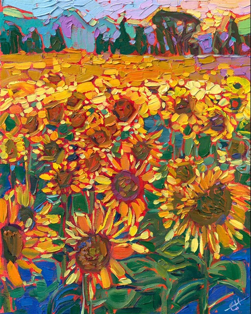 "Sunflower Fields" is an original oil painting by Erin Hanson, painted on linen board. The piece arrives framed in a gold plein air frame.