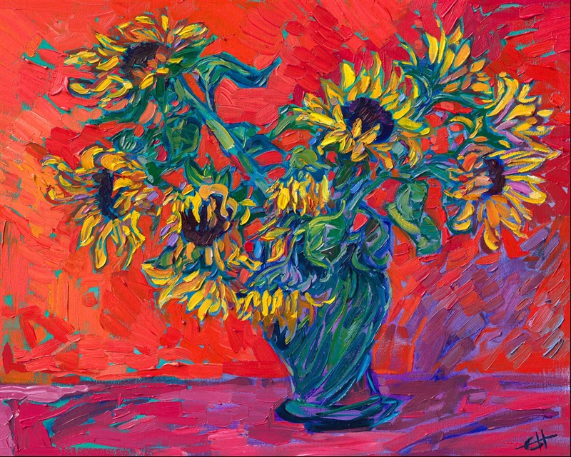 Note on varnishing: Erin’s paintings take six to eight weeks to dry, at which time we apply a retouching varnish, which allows the painting to complete the curing process while having a layer of protection against dirt and scuffs. The full curing process for an impasto oil painting takes at least two years. We are happy to assist in applying a final finishing varnish to your Erin Hanson oil painting once it has been dry for at least two years. Here is more information on how to care for your original oil painting.