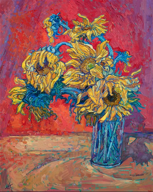 A bundle of sunflowers forms abstract shapes against a red cloth backdrop. The vibrant colors of the flowers are captured in thickly applied, impressionistic brushstrokes. "Sunflowers II" was created on 1-1/2" canvas and arrives framed in a custom-made, gold floating frame.