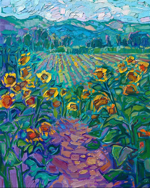 Style: "Open Impressionism" is a new style of painting developed by American artist Erin Hanson. The style is characterized by short, impasto brush strokes that are applied without layering, creating a mosaic or stained-glass appearance to the paintings. The paintings are created with a limited palette of colors, applied without blending or mixing upon the canvas, which adds a dimension of texture to each brush stroke. Inspired by classic impressionism, pointillism, and post-impressionism, Erin Hanson continues the tradition of impressionism into the modern day with her colorful and vivacious landscape paintings.
