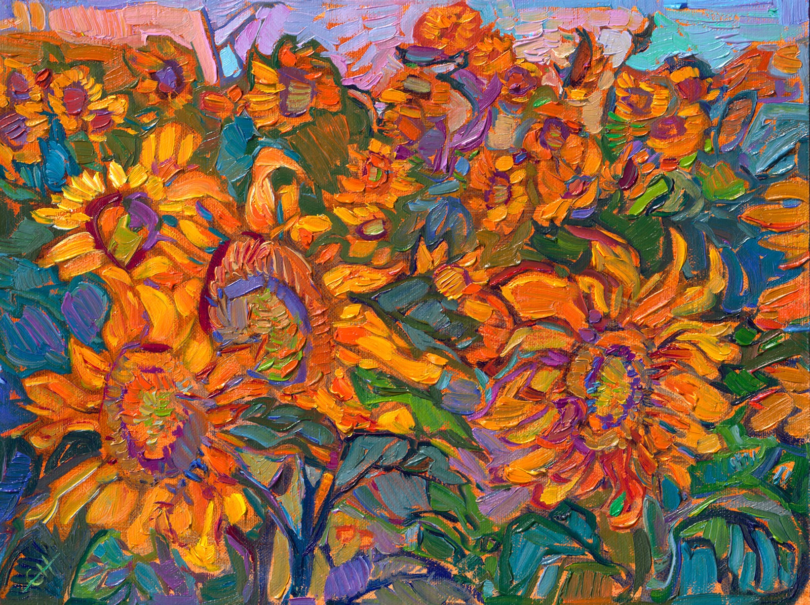 Note on varnishing: Erin’s paintings take six to eight weeks to dry, at which time we apply a retouching varnish, which allows the painting to complete the curing process while having a layer of protection against dirt and scuffs. The full curing process for an impasto oil painting takes at least two years. We are happy to assist in applying a final finishing varnish to your Erin Hanson oil painting once it has been dry for at least two years. Here is more information on how to care for your original oil painting.