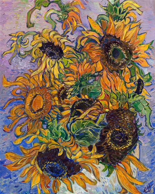 A white vase of sunflowers is captured by modern impressionist Erin Hanson with impasto oils on canvas. The vivacious brush work adds movement and color to the painting. This piece is reminiscent of van Gogh's work, but in a contemporary, Open Impressionism style.