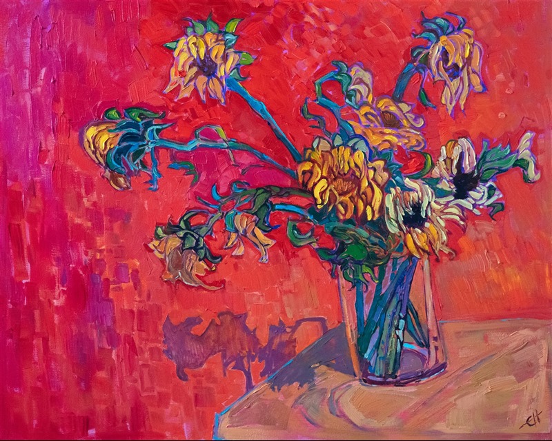 Note on varnishing: Erin’s paintings take six to eight weeks to dry, at which time we apply a retouching varnish, which allows the painting to complete the curing process while having a layer of protection against dirt and scuffs. The full curing process for an impasto oil painting takes at least two years. We are happy to assist in applying a final finishing varnish to your Erin Hanson oil painting once it has been dry for at least two years. Here is more information on how to care for your original oil painting.