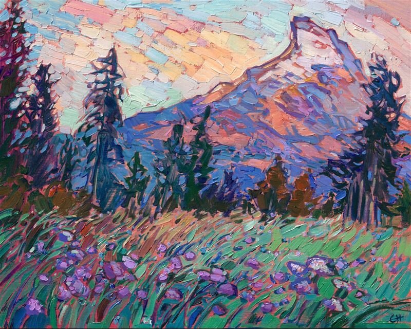 Style: "Open Impressionism" is a new style of painting developed by American artist Erin Hanson. The style is characterized by short, impasto brush strokes that are applied without layering, creating a mosaic or stained-glass appearance to the paintings. The paintings are created with a limited palette of colors, applied without blending or mixing upon the canvas, which adds a dimension of texture to each brush stroke. Inspired by classic impressionism, pointillism, and post-impressionism, Erin Hanson continues the tradition of impressionism into the modern day with her colorful and vivacious landscape paintings.