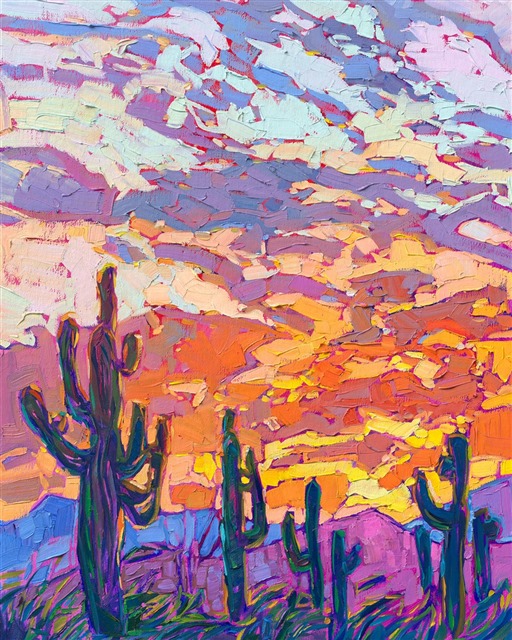 Southwest colors of desert sunset saturate the canvas in hues of orange, rust, and magenta. The brush strokes in this sunset painting are thick and impressionistic, alive with color and texture.