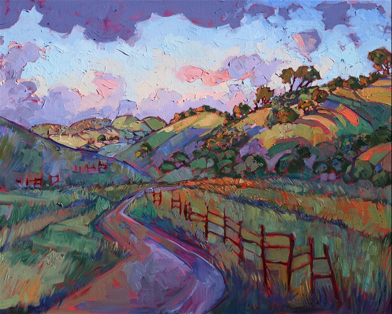 Style: "Open Impressionism" is a new style of painting developed by American artist Erin Hanson. The style is characterized by short, impasto brush strokes that are applied without layering, creating a mosaic or stained-glass appearance to the paintings. The paintings are created with a limited palette of colors, applied without blending or mixing upon the canvas, which adds a dimension of texture to each brush stroke. Inspired by classic impressionism, pointillism, and post-impressionism, Erin Hanson continues the tradition of impressionism into the modern day with her colorful and vivacious landscape paintings.