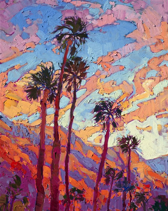 Note on varnishing: Erin’s paintings take six to eight weeks to dry, at which time we apply a retouching varnish, which allows the painting to complete the curing process while having a layer of protection against dirt and scuffs. The full curing process for an impasto oil painting takes at least two years. We are happy to assist in applying a final finishing varnish to your Erin Hanson oil painting once it has been dry for at least two years. Here is more information on how to care for your original oil painting.