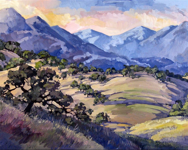 Commissioned oil painting of California's rolling green hills and ancient oak trees.