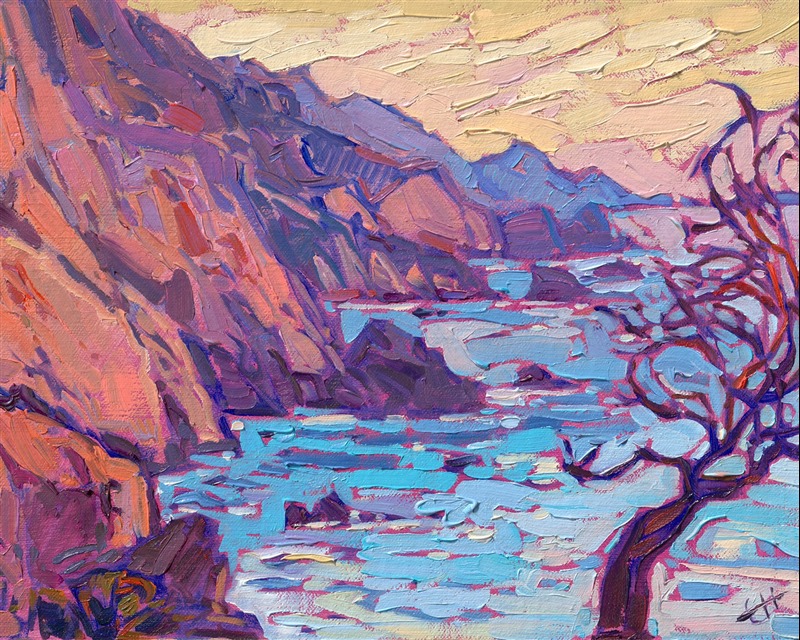 ERIN HANSON has been painting in oils since she was 8 years old. As a teenager, she apprenticed at a mural studio where she worked on 40-foot-long paintings while selling art commissions on the side. After being told it was too hard to make a living as an artist, she got her degree in Bioengineering from UC Berkeley. Afterward, Erin became a rock climber at Red Rock Canyon, Nevada. Inspired by the colorful scenery she was climbing, she decided to return to her love of painting and create one new painting every week.