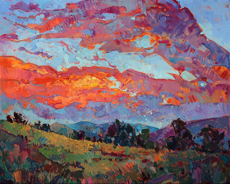 Style: "Open Impressionism" is a new style of painting developed by American artist Erin Hanson. The style is characterized by short, impasto brush strokes that are applied without layering, creating a mosaic or stained-glass appearance to the paintings. The paintings are created with a limited palette of colors, applied without blending or mixing upon the canvas, which adds a dimension of texture to each brush stroke. Inspired by classic impressionism, pointillism, and post-impressionism, Erin Hanson continues the tradition of impressionism into the modern day with her colorful and vivacious landscape paintings.