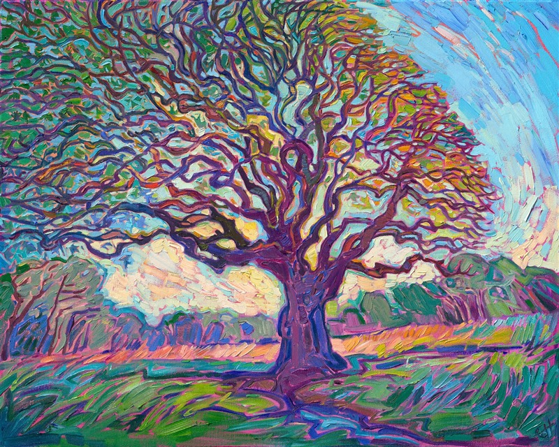 Style: "Open Impressionism" is a new style of painting developed by American artist Erin Hanson. The style is characterized by short, impasto brush strokes that are applied without layering, creating a mosaic or stained-glass appearance to the paintings. The paintings are created with a limited palette of colors, applied without blending or mixing upon the canvas, which adds a dimension of texture to each brush stroke. Inspired by classic impressionism, pointillism, and post-impressionism, Erin Hanson continues the tradition of impressionism into the modern day with her colorful and vivacious landscape paintings.