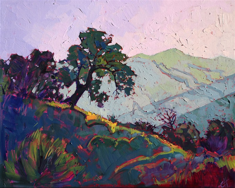 Style: "Open Impressionism" is a new style of painting developed by American artist Erin Hanson. The style is characterized by short, impasto brush strokes that are applied without layering, creating a mosaic or stained-glass appearance to the paintings. The paintings are created with a limited palette of colors, applied without blending or mixing upon the canvas, which adds a dimension of texture to each brush stroke. Inspired by classic impressionism, pointillism, and post-impressionism, Erin Hanson continues the tradition of impressionism into the modern day with her colorful and vivacious landscape paintings.