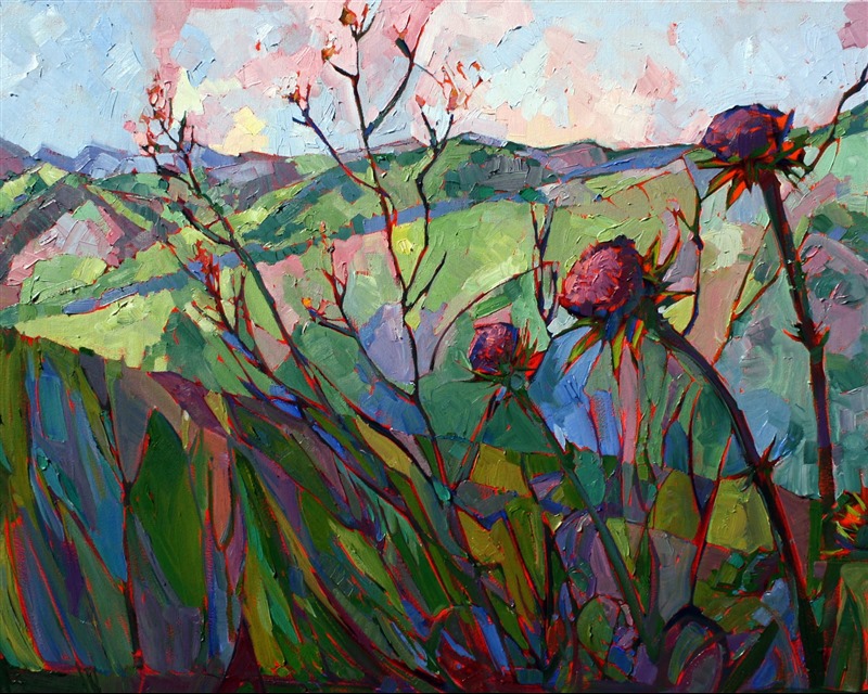 Style: "Open Impressionism" is a new style of painting developed by American artist Erin Hanson. The style is characterized by short, impasto brush strokes that are applied without layering, creating a mosaic or stained-glass appearance to the paintings. The paintings are created with a limited palette of colors, applied without blending or mixing upon the canvas, which adds a dimension of texture to each brush stroke. Inspired by classic impressionism, pointillism, and post-impressionism, Erin Hanson continues the tradition of impressionism into the modern day with her colorful and vivacious landscape paintings.
