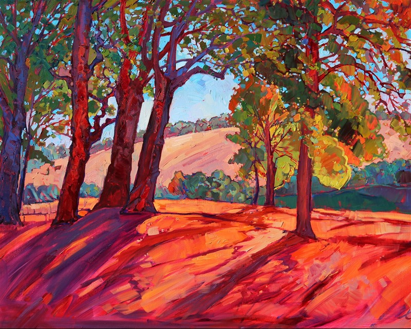 Long shadows in shades of purple set off the rich greens and golds of a summer landscape in Paso Robles, California. The brush strokes in this painting are thick, full of texture and movement, creating an unexpected burst of color.
