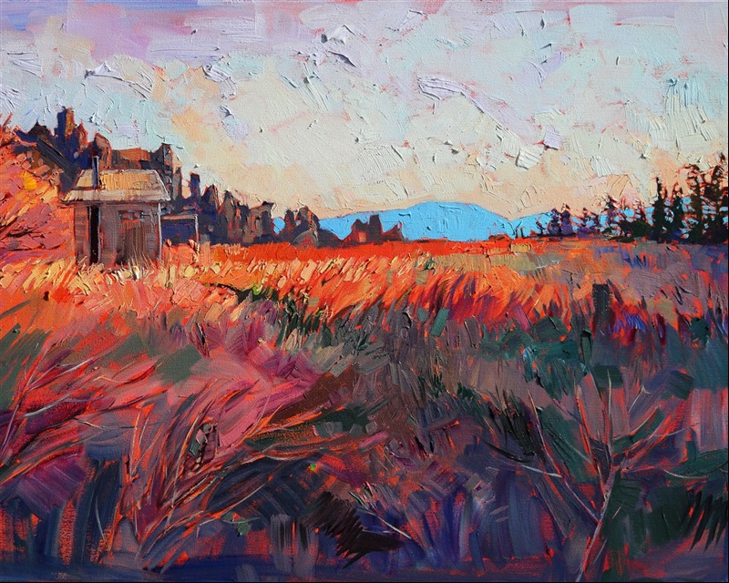 Style: "Open Impressionism" is a new style of painting developed by American artist Erin Hanson. The style is characterized by short, impasto brush strokes that are applied without layering, creating a mosaic or stained-glass appearance to the paintings. The paintings are created with a limited palette of colors, applied without blending or mixing upon the canvas, which adds a dimension of texture to each brush stroke. Inspired by classic impressionism, pointillism, and post-impressionism, Erin Hanson continues the tradition of impressionism into the modern day with her colorful and vivacious landscape paintings.