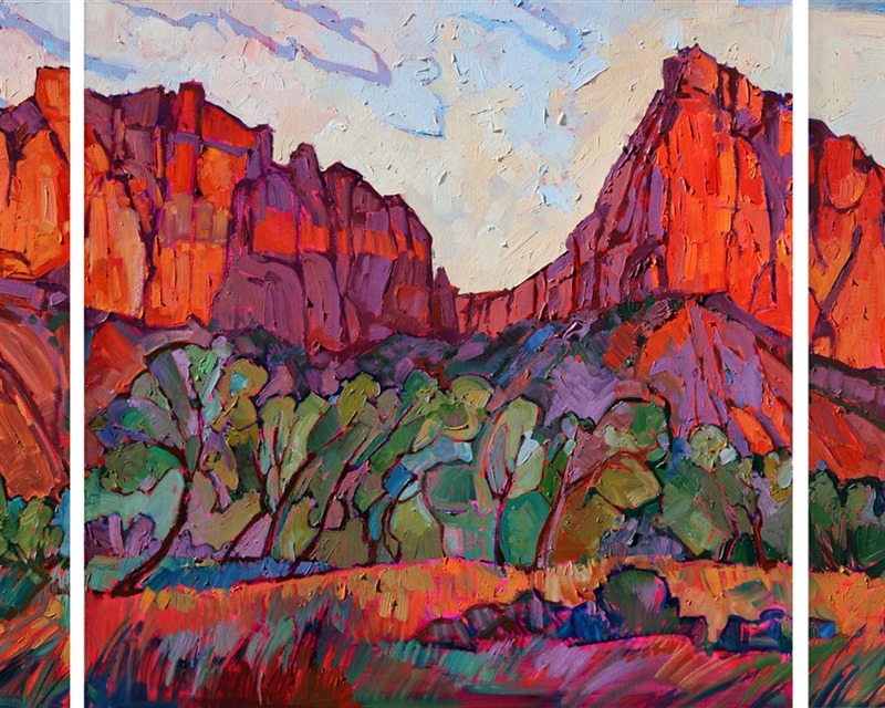 This painting was done on three gallery-wrapped canvas, with the painting continuing around all the edges, creating a different view from different angles. The colors and life of Zion National Park are captured in brilliant colors and thick brush work.