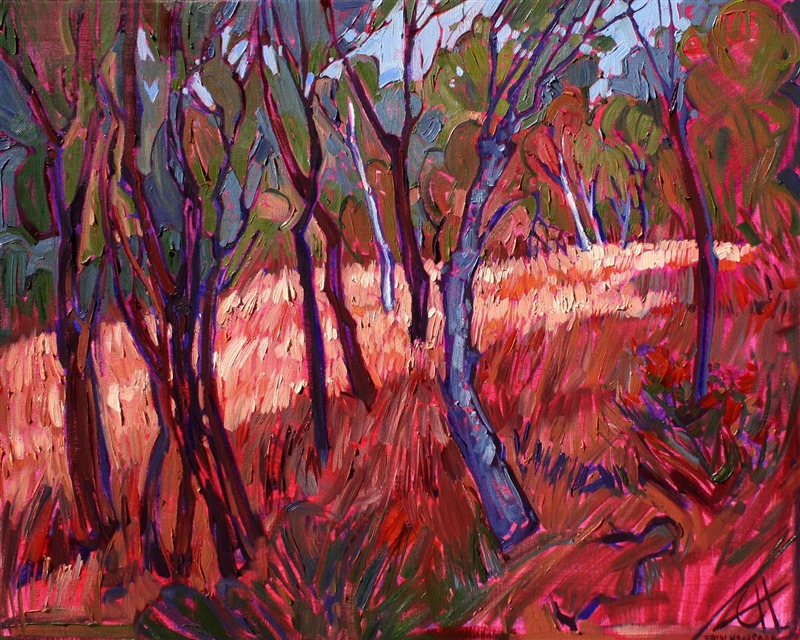 Cast in the red hues of late afternoon, this painting captures the life and movement of a grove of California cottonwoods and birches. This painting has an almost abstract feel, with highly textured brush strokes and thick paint application.