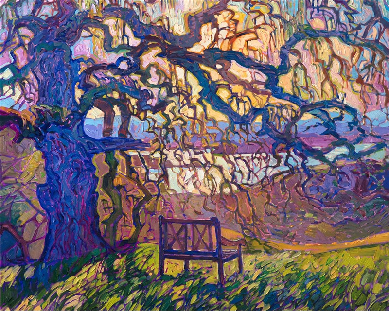 Style: "Open Impressionism" is a new style of painting developed by American artist Erin Hanson. The style is characterized by short, impasto brush strokes that are applied without layering, creating a mosaic or stained-glass appearance to the paintings. The paintings are created with a limited palette of colors, applied without blending or mixing upon the canvas, which adds a dimension of texture to each brush stroke. Inspired by classic impressionism, pointillism, and post-impressionism, Erin Hanson continues the tradition of impressionism into the modern day with her colorful and vivacious landscape paintings.