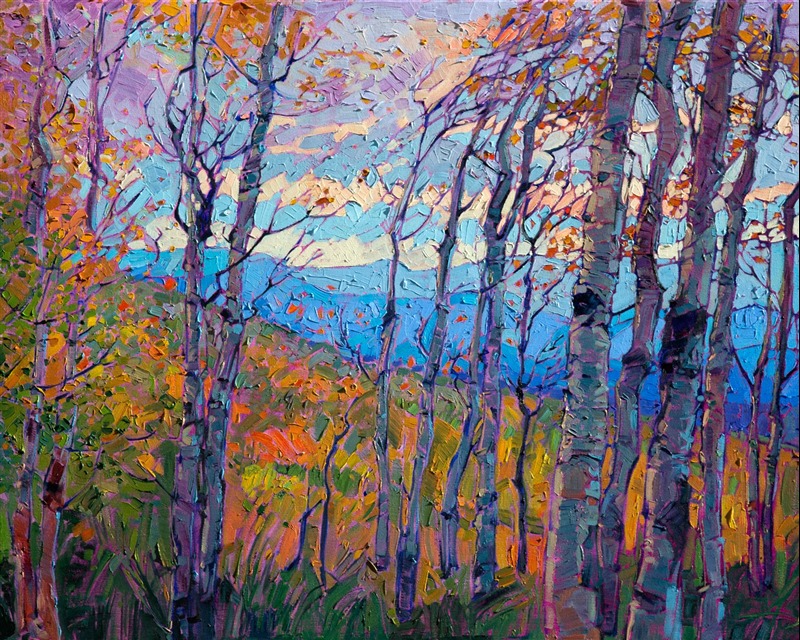Style: "Open Impressionism" is a new style of painting developed by American artist Erin Hanson. The style is characterized by short, impasto brush strokes that are applied without layering, creating a mosaic or stained-glass appearance to the paintings. The paintings are created with a limited palette of colors, applied without blending or mixing upon the canvas, which adds a dimension of texture to each brush stroke. Inspired by classic impressionism, pointillism, and post-impressionism, Erin Hanson continues the tradition of impressionism into the modern day with her colorful and vivacious landscape paintings.