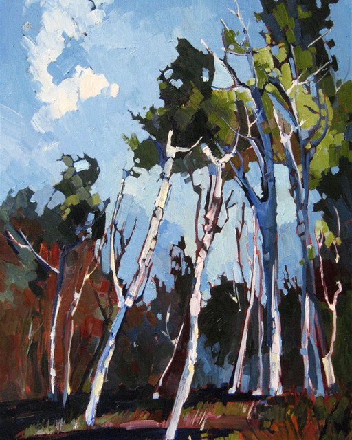 Beautiful, colorful birch trees are captured with thick brush strokes and lively contrasts. This painting was inspired by a drive through the high desert forests of Utah.