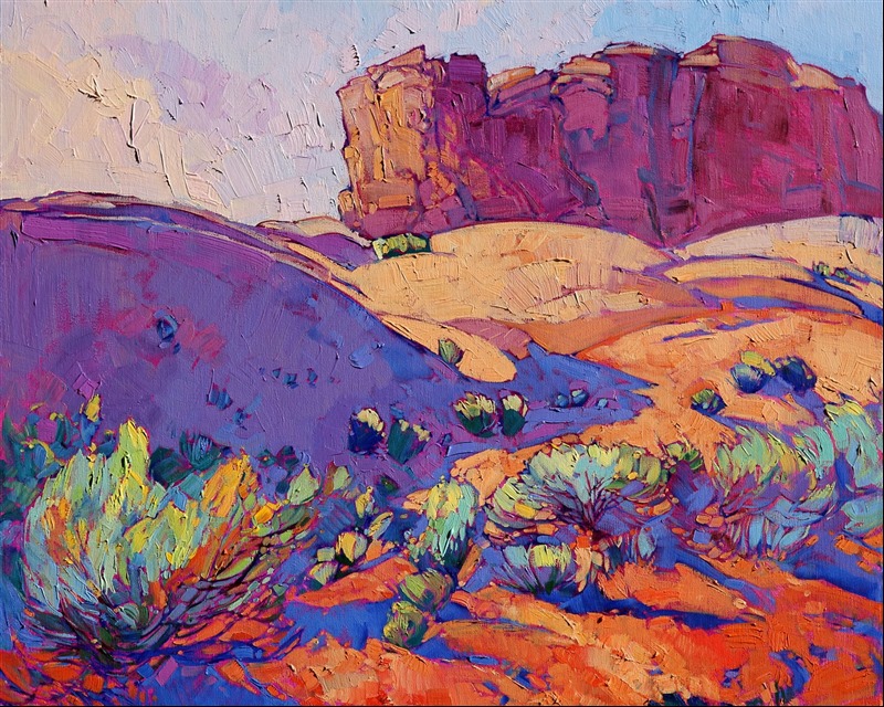 Style: "Open Impressionism" is a new style of painting developed by American artist Erin Hanson. The style is characterized by short, impasto brush strokes that are applied without layering, creating a mosaic or stained-glass appearance to the paintings. The paintings are created with a limited palette of colors, applied without blending or mixing upon the canvas, which adds a dimension of texture to each brush stroke. Inspired by classic impressionism, pointillism, and post-impressionism, Erin Hanson continues the tradition of impressionism into the modern day with her colorful and vivacious landscape paintings.