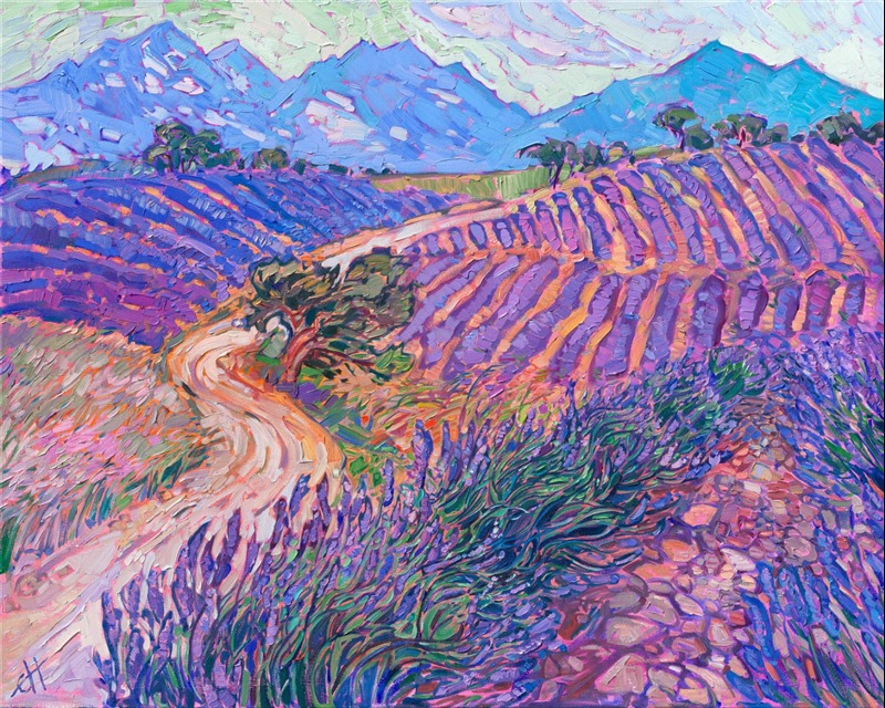 Exploring the lavender fields on the high plateaus of Provence, France, was an experience I will never forget. I caught two sunsets and two sunrises among the lavender fields, and I have enough inspiration to last me a lifetime! After painting vineyards for so many years, it is fun to paint purple cultivated rows instead. The ground between the lavender plants is covered in warm-hued stones, adding additional texture and color contrast to the landscape.