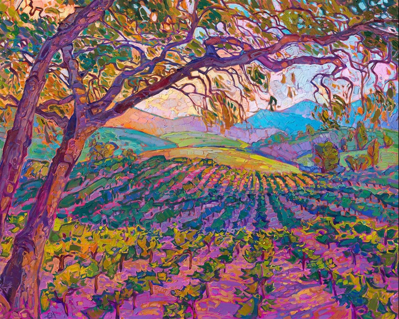 Wine country paintings are perfect for anyone who loves the iconic landscapes where grapevines grow. Often nestled near a coastline, with hills and coastal mountains, oak trees and evergreens, viticultural landscapes are some of the most beautiful landscapes an artist can find to paint. Erin Hanson has three collections in her portfolio for lovers of wine country: The Wine Country Collection, The Vineyard Collection, and The Oaks and Hills Collection.