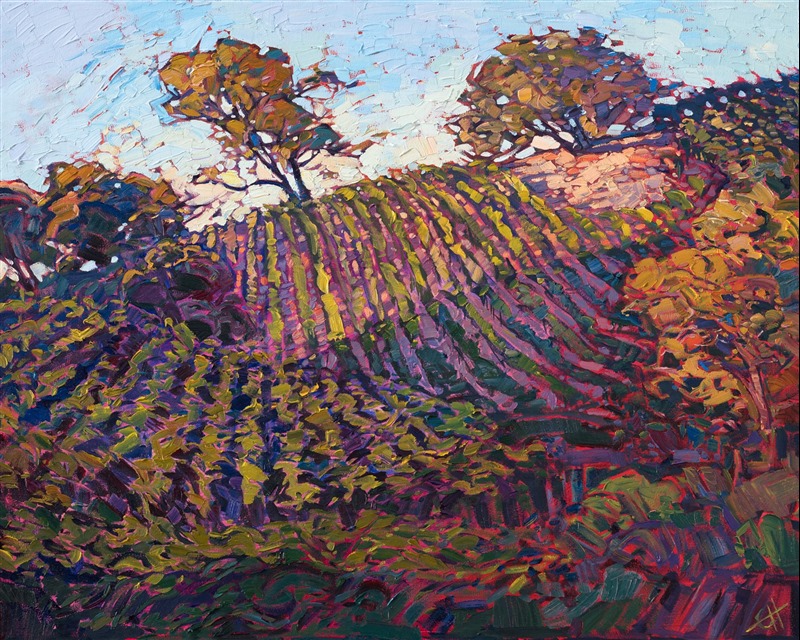 Note on varnishing: Erin’s paintings take six to eight weeks to dry, at which time we apply a retouching varnish, which allows the painting to complete the curing process while having a layer of protection against dirt and scuffs. The full curing process for an impasto oil painting takes at least two years. We are happy to assist in applying a final finishing varnish to your Erin Hanson oil painting once it has been dry for at least two years. Here is more information on how to care for your original oil painting.