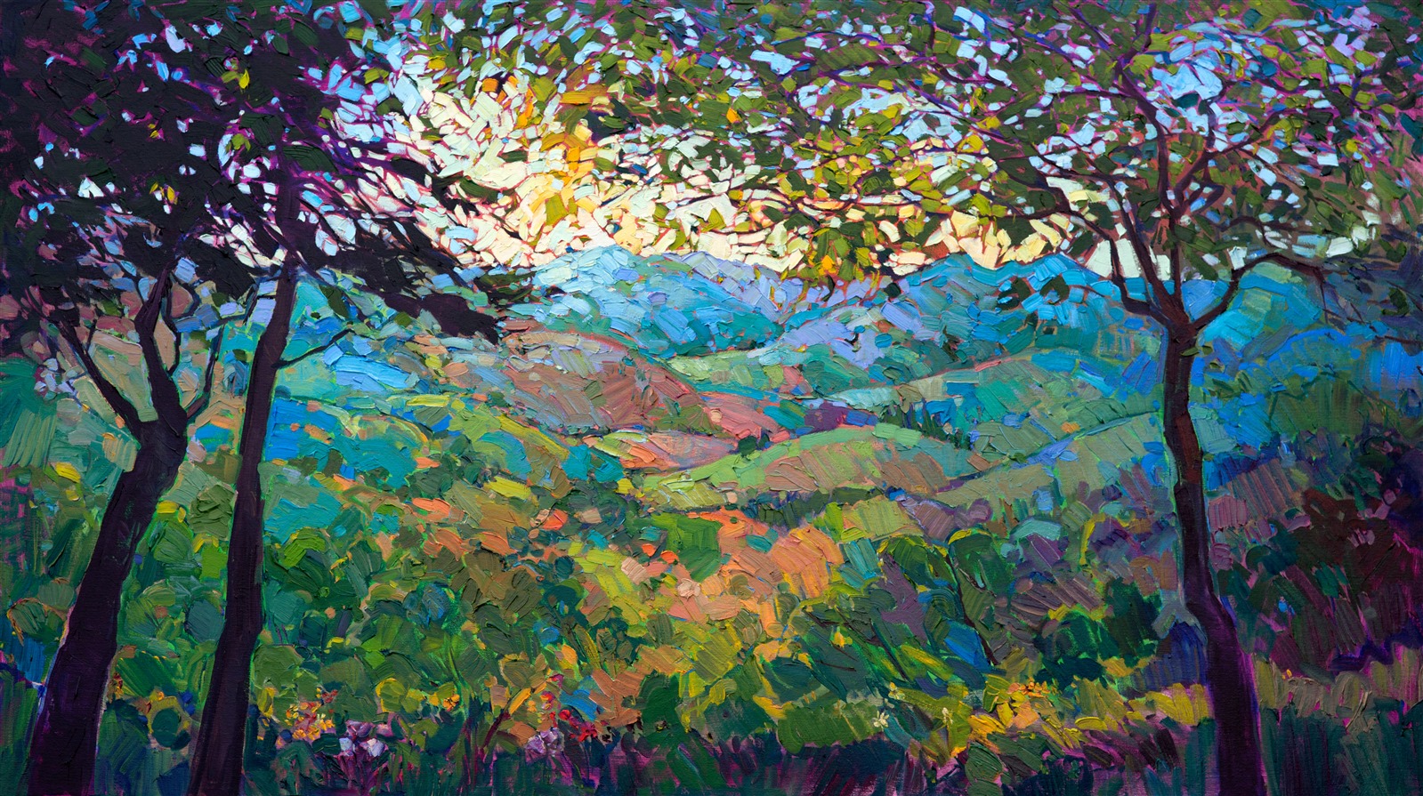 The rolling hills of California wine country are caught in scintillating detail and framed by prismatic oaks in this modern-day impressionistic masterpiece. The California colors were alive and vibrant during a bright summer dawn.