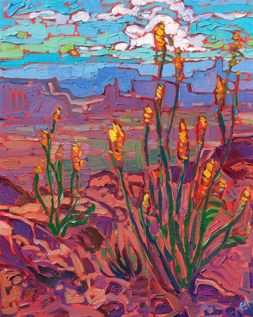 Note on varnishing: Erin’s paintings take six to eight weeks to dry, at which time we apply a retouching varnish, which allows the painting to complete the curing process while having a layer of protection against dirt and scuffs. The full curing process for an impasto oil painting takes at least two years. We are happy to assist in applying a final finishing varnish to your Erin Hanson oil painting once it has been dry for at least two years. Here is more information on how to care for your original oil painting.