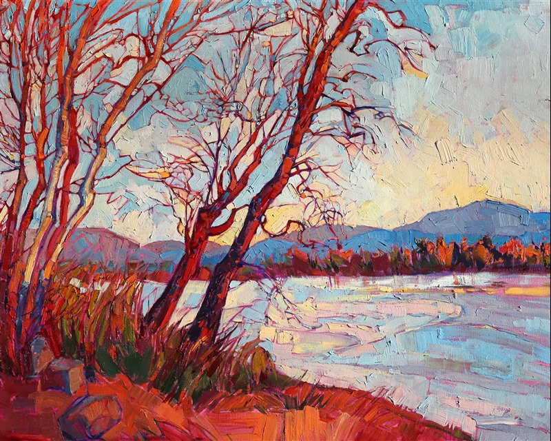 Lakeside Montana trees bask in the late afternoon light, waiting for spring. Impasto brush strokes move within the landscape, creating a bold mosaic of color and light.