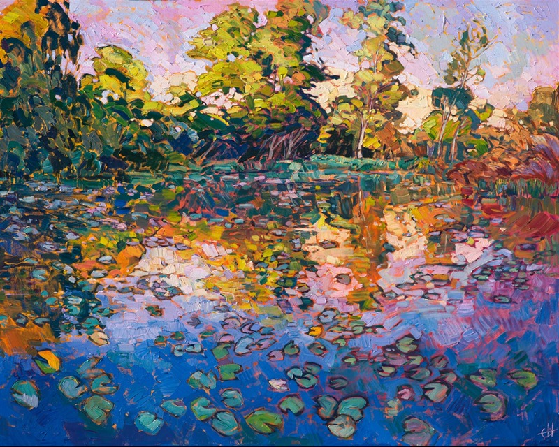 This painting was inspired by the water lily pond at the Norton Simon Museum, a wonderful impressionism museum in Pasadena, California. This painting captures the beautiful late afternoon light of California, reflected in a tree-sheltered pool of water. This painting is my tribute to the classic impressionist greats.
