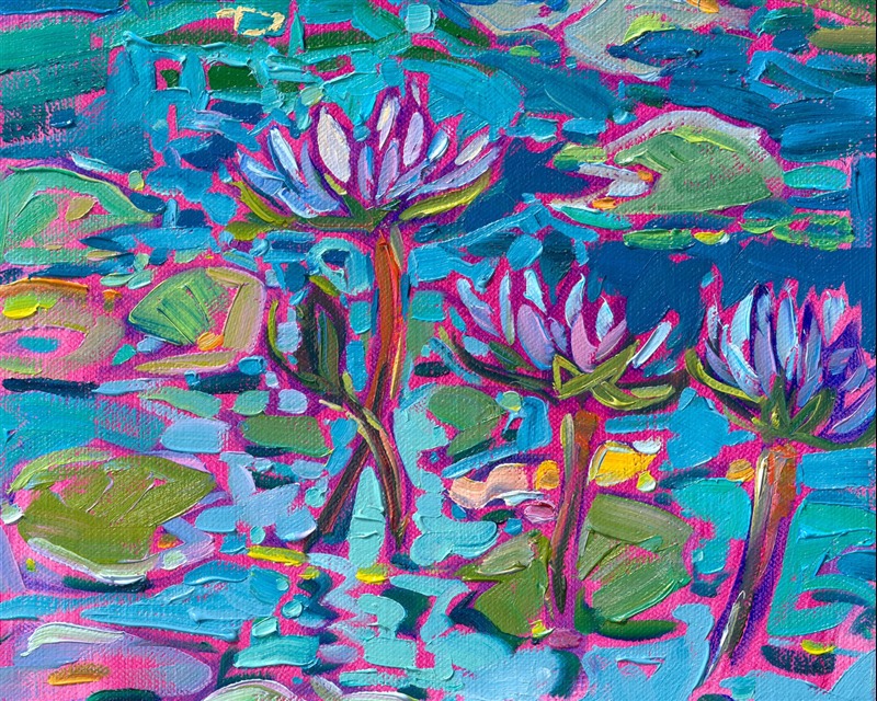 "Water Lilies in Petite" is an original oil painting on linen board, done in Erin Hanson's signature Open Impressionism style. The piece arrives framed in a wide, mock floater frame finished in black with gold edging.