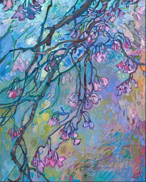 I returned to Japan this year (after exploring their famous Japanese maple tree fall colors), this time to experience sakura -- the Japanese cherry blossom. This pink weeping cherry blooms after the abundant white cherry trees, and their delicate blooms are more rare and, therefore, more precious. This painting captures a weeping branch of pink cherry blooms with thick, expressive brush strokes and subtle color changes.