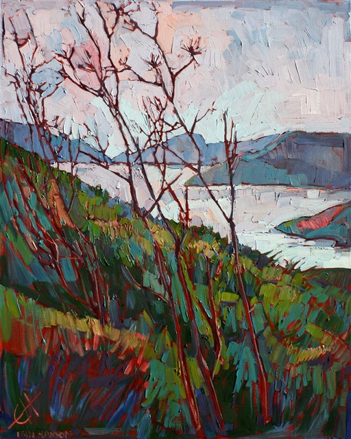 Style: "Open Impressionism" is a new style of painting developed by American artist Erin Hanson. The style is characterized by short, impasto brush strokes that are applied without layering, creating a mosaic or stained-glass appearance to the paintings. The paintings are created with a limited palette of colors, applied without blending or mixing upon the canvas, which adds a dimension of texture to each brush stroke. Inspired by classic impressionism, pointillism, and post-impressionism, Erin Hanson continues the tradition of impressionism into the modern day with her colorful and vivacious landscape paintings.
