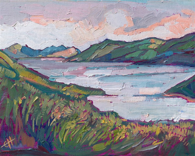 Note on varnishing: Erin’s paintings take six to eight weeks to dry, at which time we apply a retouching varnish, which allows the painting to complete the curing process while having a layer of protection against dirt and scuffs. The full curing process for an impasto oil painting takes at least two years. We are happy to assist in applying a final finishing varnish to your Erin Hanson oil painting once it has been dry for at least two years. Here is more information on how to care for your original oil painting.