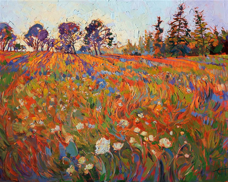 Style: "Open Impressionism" is a new style of painting developed by American artist Erin Hanson. The style is characterized by short, impasto brush strokes that are applied without layering, creating a mosaic or stained-glass appearance to the paintings. The paintings are created with a limited palette of colors, applied without blending or mixing upon the canvas, which adds a dimension of texture to each brush stroke. Inspired by classic impressionism, pointillism, and post-impressionism, Erin Hanson continues the tradition of impressionism into the modern day with her colorful and vivacious landscape paintings.