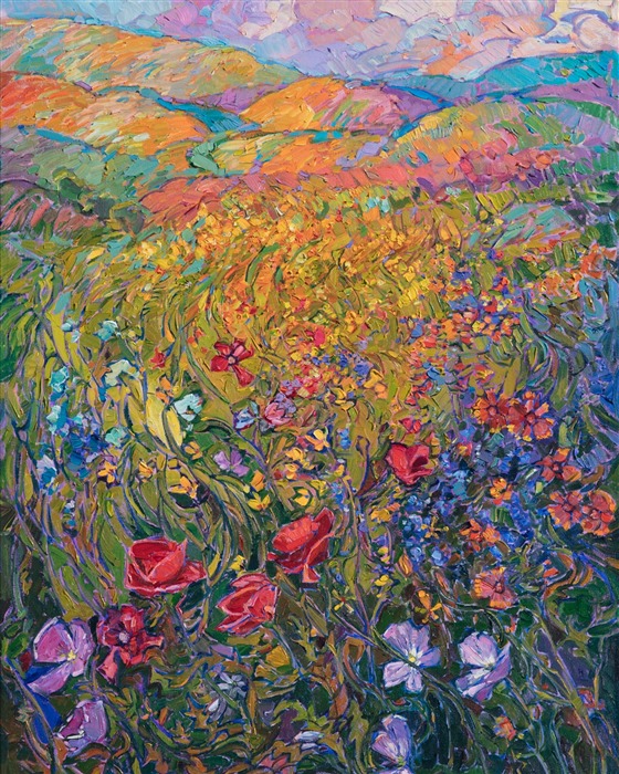 Style: "Open Impressionism" is a new style of painting developed by American artist Erin Hanson. The style is characterized by short, impasto brush strokes that are applied without layering, creating a mosaic or stained-glass appearance to the paintings. The paintings are created with a limited palette of colors, applied without blending or mixing upon the canvas, which adds a dimension of texture to each brush stroke. Inspired by classic impressionism, pointillism, and post-impressionism, Erin Hanson continues the tradition of impressionism into the modern day with her colorful and vivacious landscape paintings.