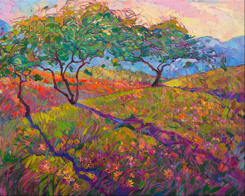 Style: "Open Impressionism" is a new style of painting developed by American artist Erin Hanson. The style is characterized by short, impasto brush strokes that are applied without layering, creating a mosaic or stained-glass appearance to the paintings. The paintings are created with a limited palette of colors, applied without blending or mixing upon the canvas, which adds a dimension of texture to each brush stroke. Inspired by classic impressionism, pointillism, and post-impressionism, Erin Hanson continues the tradition of impressionism into the modern day with her colorful and vivacious landscape paintings.