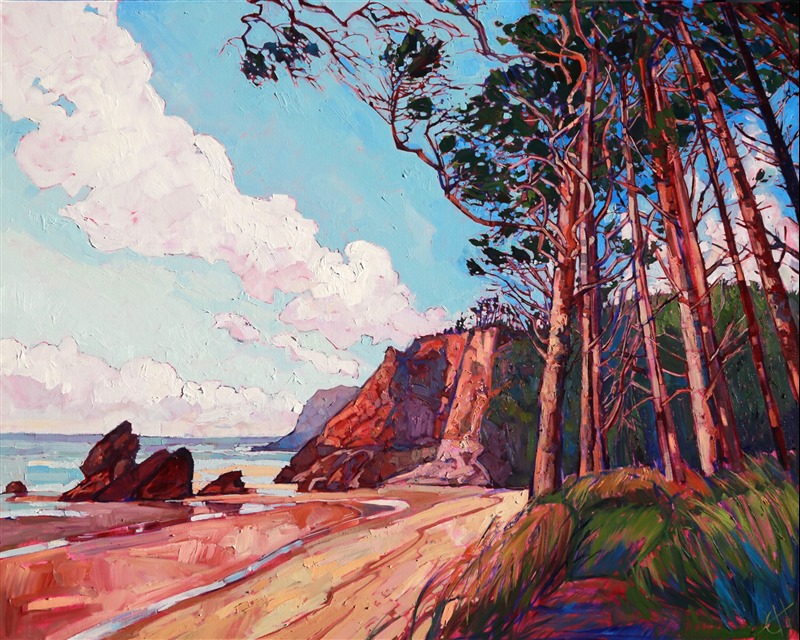 Exploring the Oregon and Washington coasts in July brought many new landscapes that will play under Erin's paintbrush. This painting was inspired by the coast just north of Tillamook. The brush strokes are thick and impressionistic, full of color and motion.