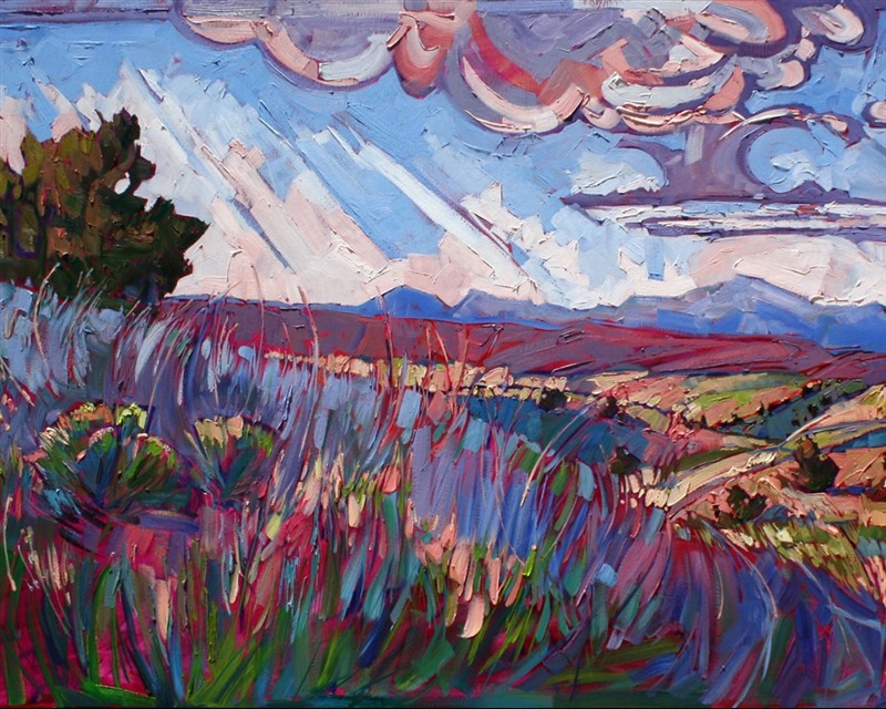Style: "Open Impressionism" is a new style of painting developed by American artist Erin Hanson. The style is characterized by short, impasto brush strokes that are applied without layering, creating a mosaic or stained-glass appearance to the paintings. The paintings are created with a limited palette of colors, applied without blending or mixing upon the canvas, which adds a dimension of texture to each brush stroke. Inspired by classic impressionism, pointillism, and post-impressionism, Erin Hanson continues the tradition of impressionism into the modern day with her colorful and vivacious landscape paintings.
